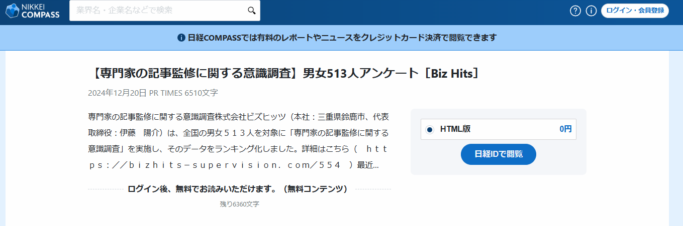 専門家の監修に関する意識調査がNIKKEI COMPASS(日本経済新聞)に掲載されました 更新日:2025.01.10 Biz Hits記事監修サービスが独自に行った専門家の監修に関する意識調査の結果が、NIKKEI COMPASS(日本経済新聞)など、各ニュースメディアに掲載されました。 >> 掲載記事はこちらから確認できます。 ホーム / お知らせ / 専門家の監修に関する意識調査がNIKKEI COMPASS(日本経済新聞)に掲載されました